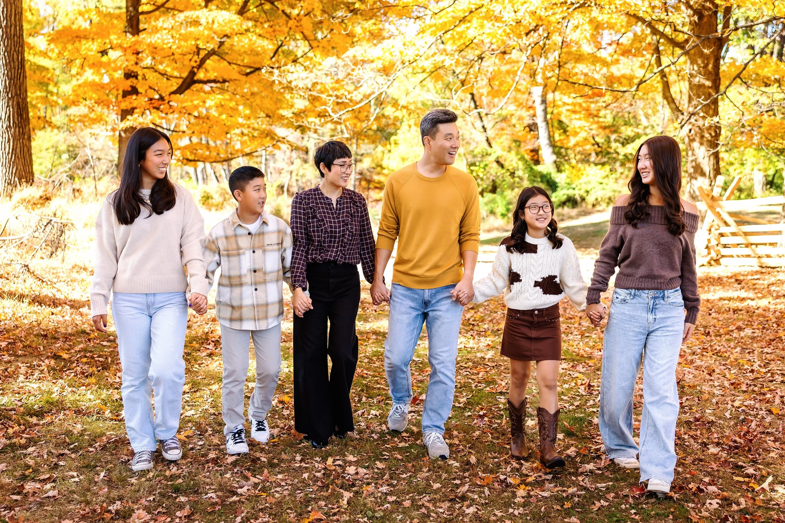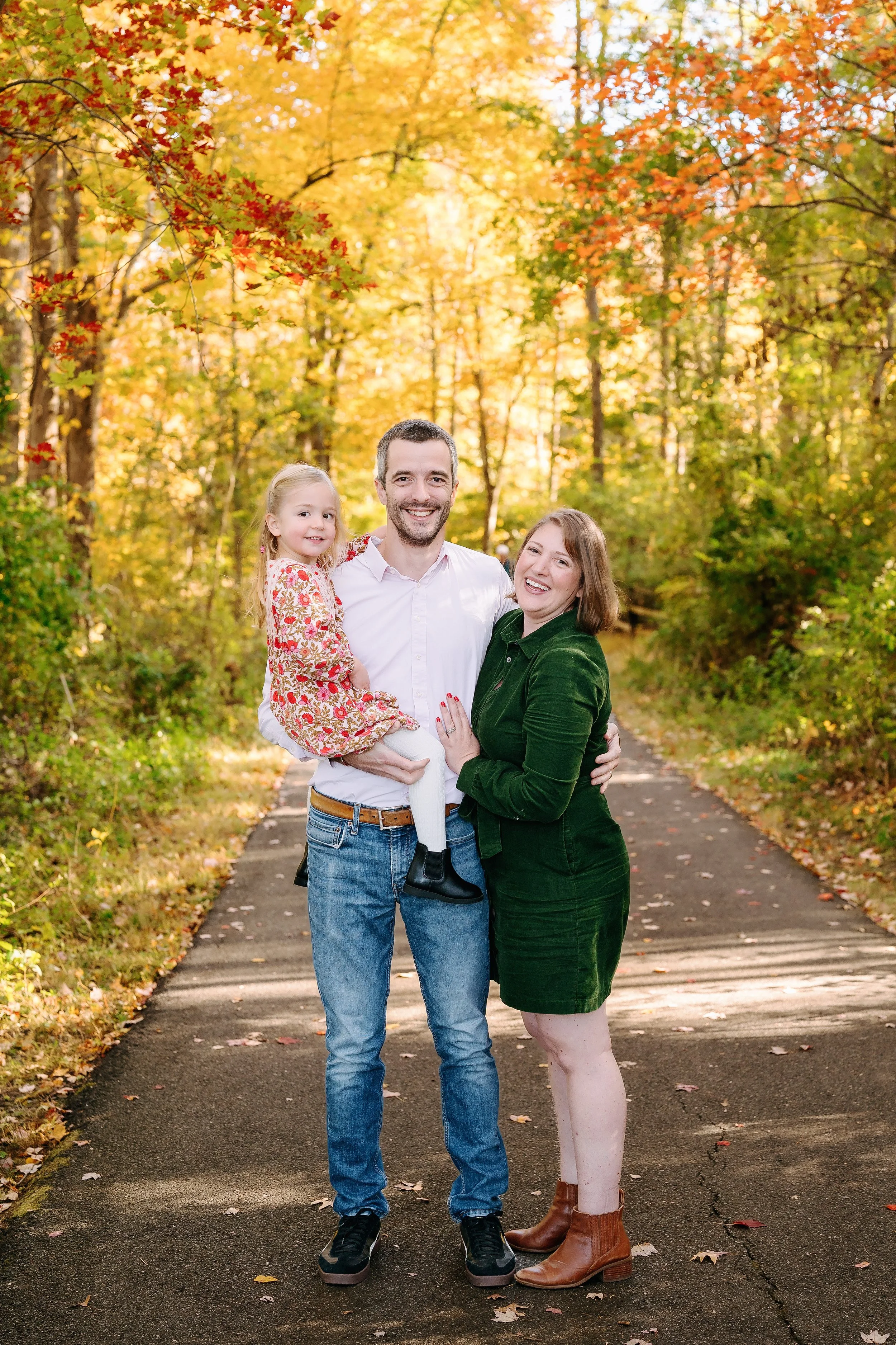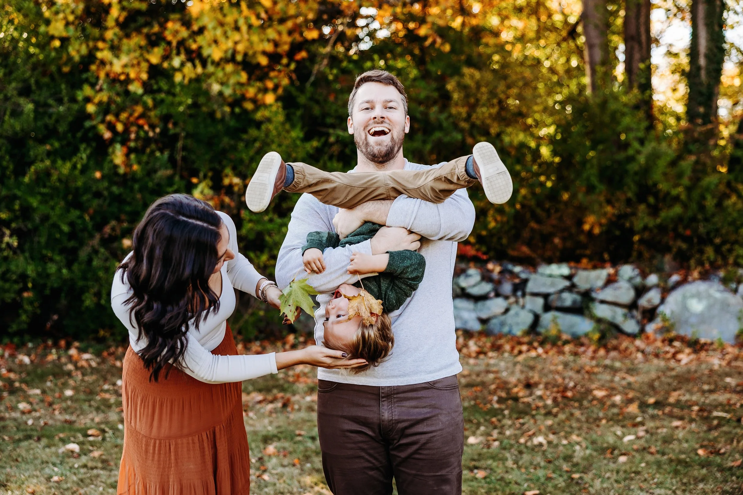 Colors that work well for fall sessions are gold, orange, green, blue, black, brown, maroon, white, neutrals. Since fall color can be so bright, I would recommend either muted colors or deep colors (dark green, navy, etc).